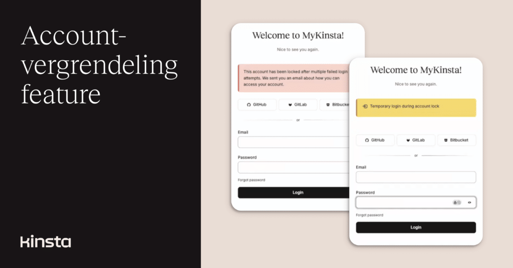 Als onderdeel van onze voortdurende inspanningen om de veiligheid van het platform te verbeteren en de accounts van klanten te beschermen, hebben we een nieuw systeem voor accountvergrendeling geïntroduceerd in het MyKinsta dashboard. Dit volgt op onze recente stap om tweefactorauthenticatie (2FA) verplicht te stellen voor alle aanmeldingen.