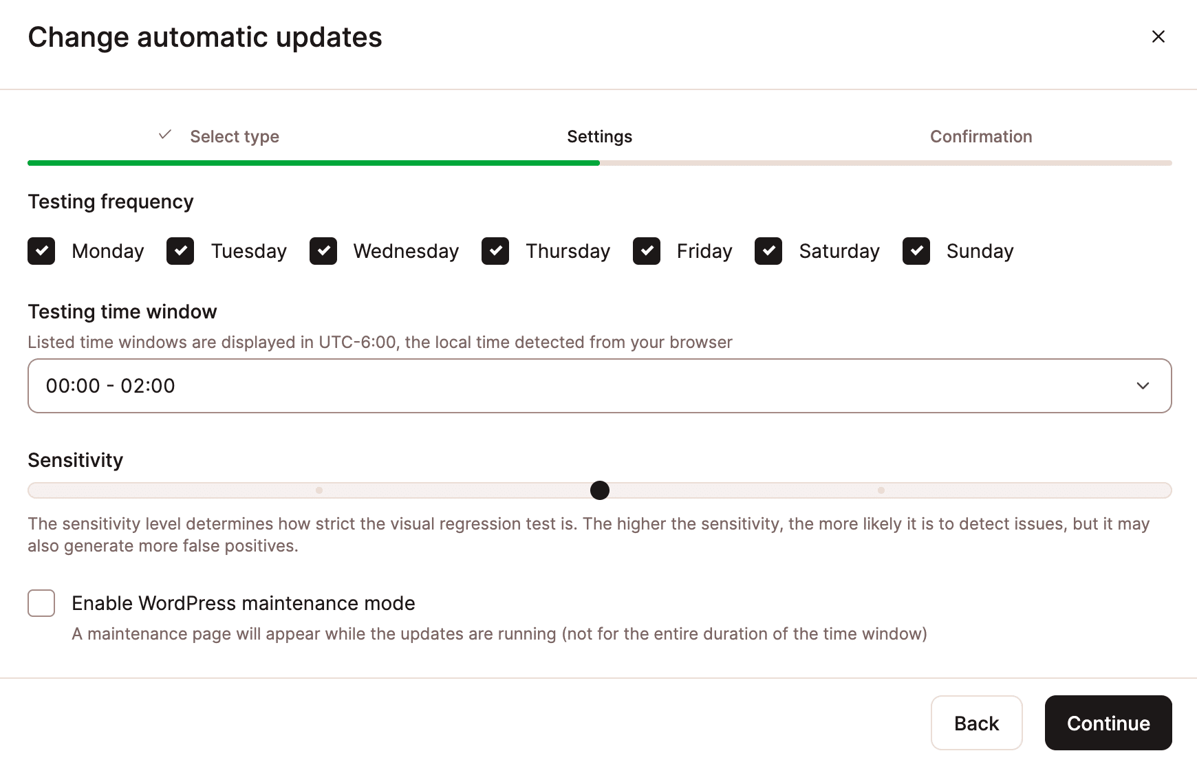 Selecione essa opção para exibir uma página de manutenção do WordPress quando as atualizações estiverem em execução. A página de manutenção permanecerá em vigor durante o tempo necessário para que as atualizações sejam concluídas – não necessariamente os valores selecionados para a janela de tempo de teste.