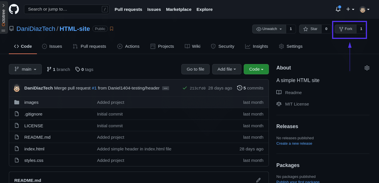 Para bifurcar o site HTML, vá até este repositório GitHub e clique no botão Fork localizado no canto superior direito da página: