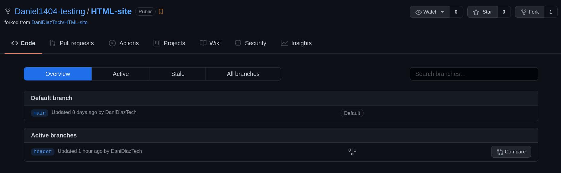 Depois disso, você deve ser capaz de ver uma nova filial chamada header em seu repositóri o bifurcado (por exemplo https://github.com/yourusername/HTML-site/branches):