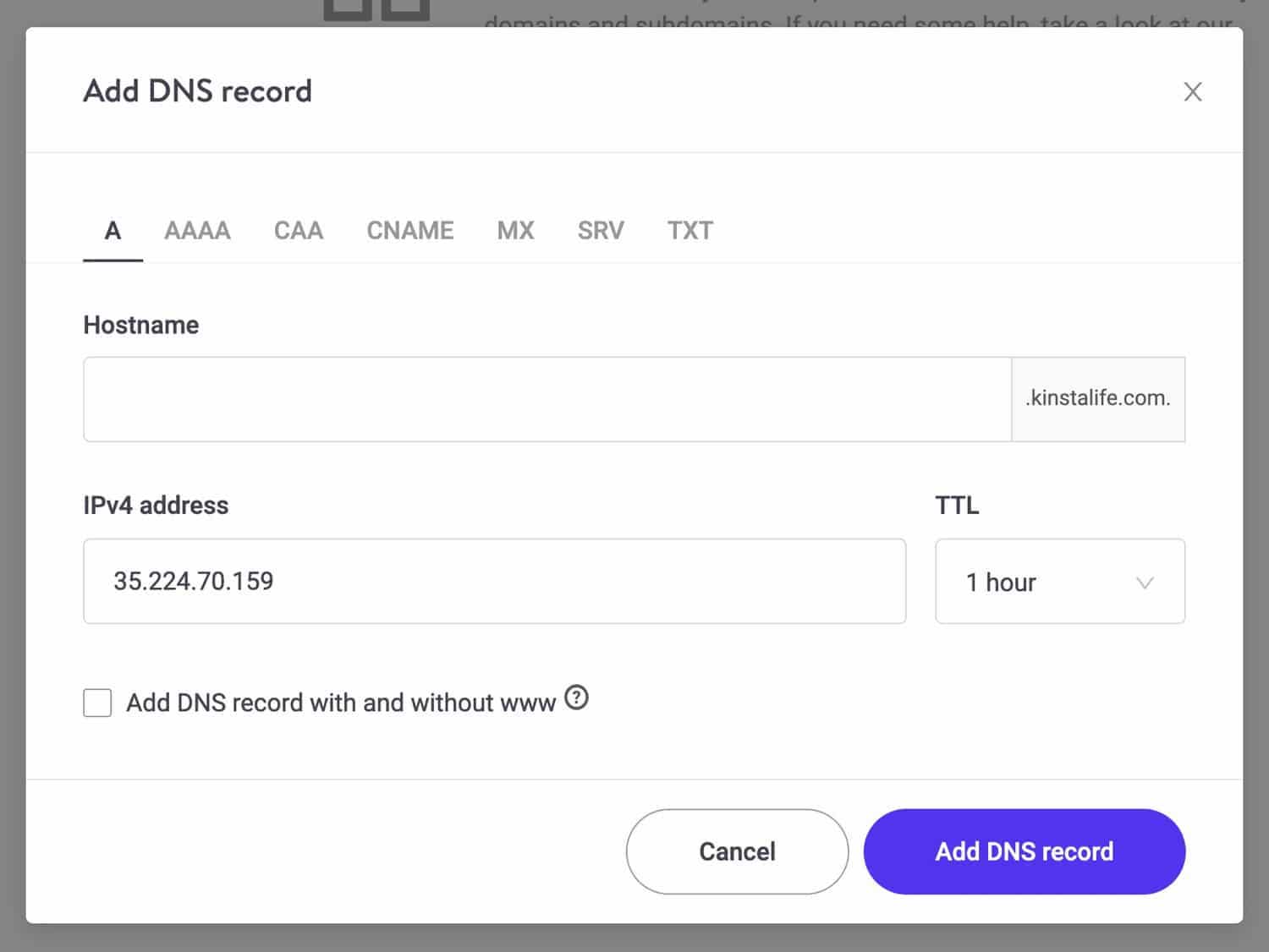 Por padrão, a maioria das TTL para seus registros DNS será definida em um intervalo de tempo de 1 a 4 horas. Por exemplo, quando você aponta seu domínio para Kinsta, você tem a opção de definir a TTL.