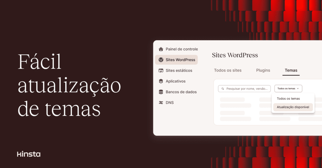 Após o lançamento da nossa ferramenta aprimorada de gerenciamento de plugins, estamos disponibilizando a mesma funcionalidade para temas. Isso significa que os clientes agora têm uma localização central no painel MyKinsta para rastrear e iniciar atualizações de temas disponíveis em todos os seus sites WordPress.
