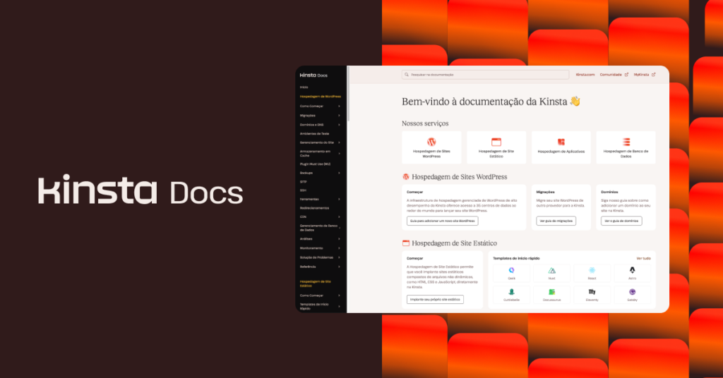 Nossa nova página inicial é um hub central para todas as áreas de documentação de produtos. Se estiver procurando informações sobre Hospedagem Gerenciada de Sites WordPress, Hospedagem de Site Estático, Hospedagem de Aplicativos ou Hospedagem de Banco de Dados, você encontrará tudo convenientemente organizado e de fácil acesso. Além disso, nossos guias de início rápido o ajudarão a começar a trabalhar em pouco tempo.