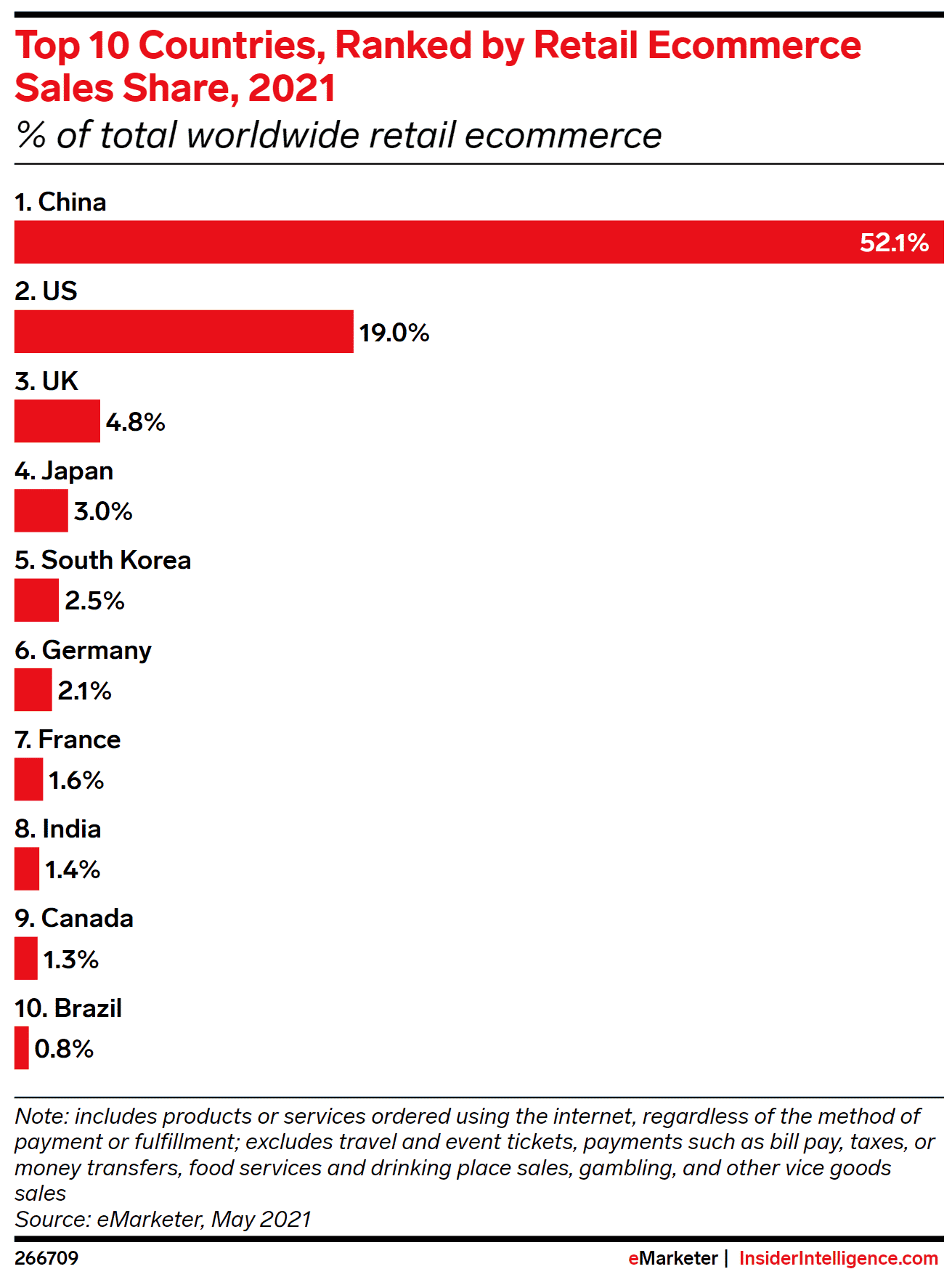 A China ainda é o maior player no mercado global de eCommerce, gerando 52,1% das vendas de eCommerce de varejo em todo o mundo (contra os 19% dos Estados Unidos). Alimentada pela China, a região Ásia-Pacífico é o maior mercado para o eCommerce varejista, com vendas digitais totalizando quase 3 trilhões de dólares em 2021.