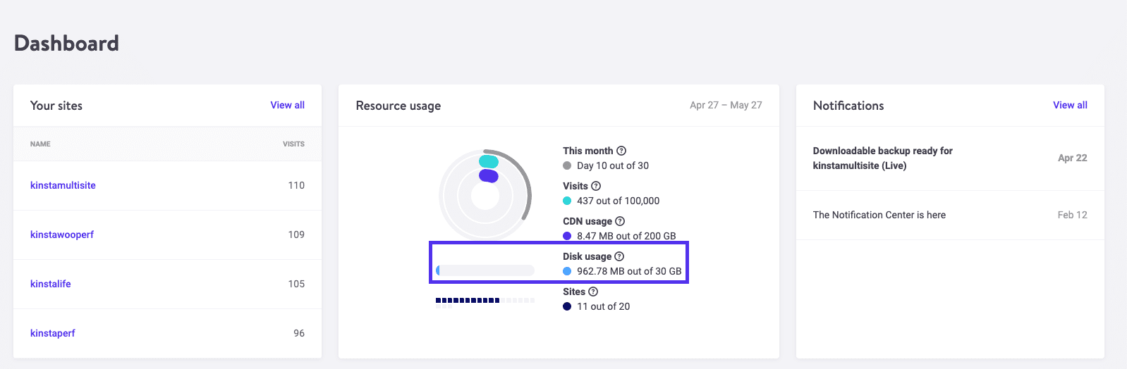 De flesta hosting-konton listar hur mycket diskutrymme du använder för tillfället. Kinsta´s kunder kan hitta den här informationen i MyKinsta´s instrumentpanel, under Resursanvändning: