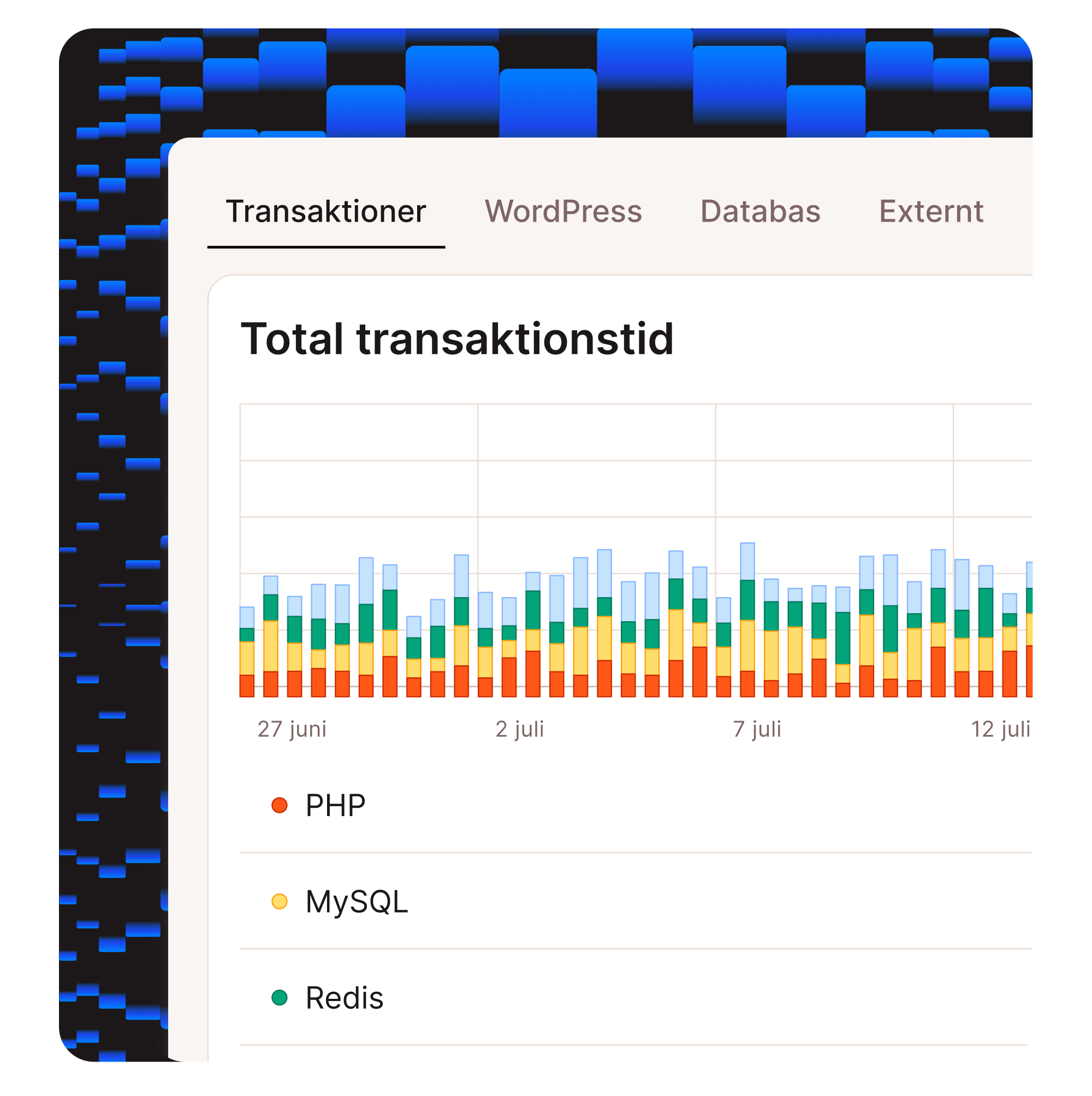 Kinstas Application Performance Monitoring (APM) visualiserar problem med webbplatshastighet. Oavsett dina tekniska färdigheter, identifiera enkelt flaskhalsar och vidta åtgärder. Till skillnad från våra konkurrenter är Kinsta APM hembyggt och ingår gratis i alla våra hosting-planer för WordPress. Säg adjö till externa plugins eller betalda tjänster som New Relic.